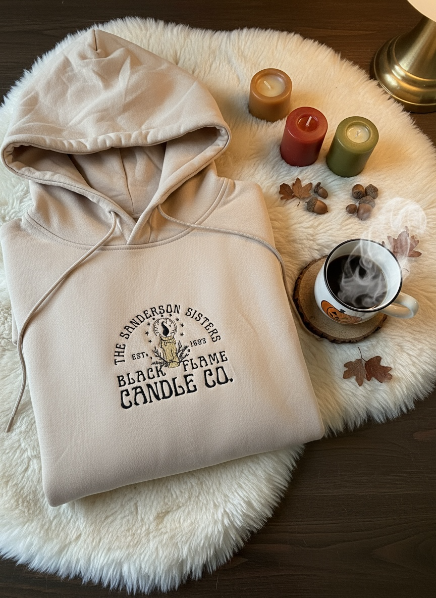 Garment Description: Cream Color Hoodie with Black Flame Design