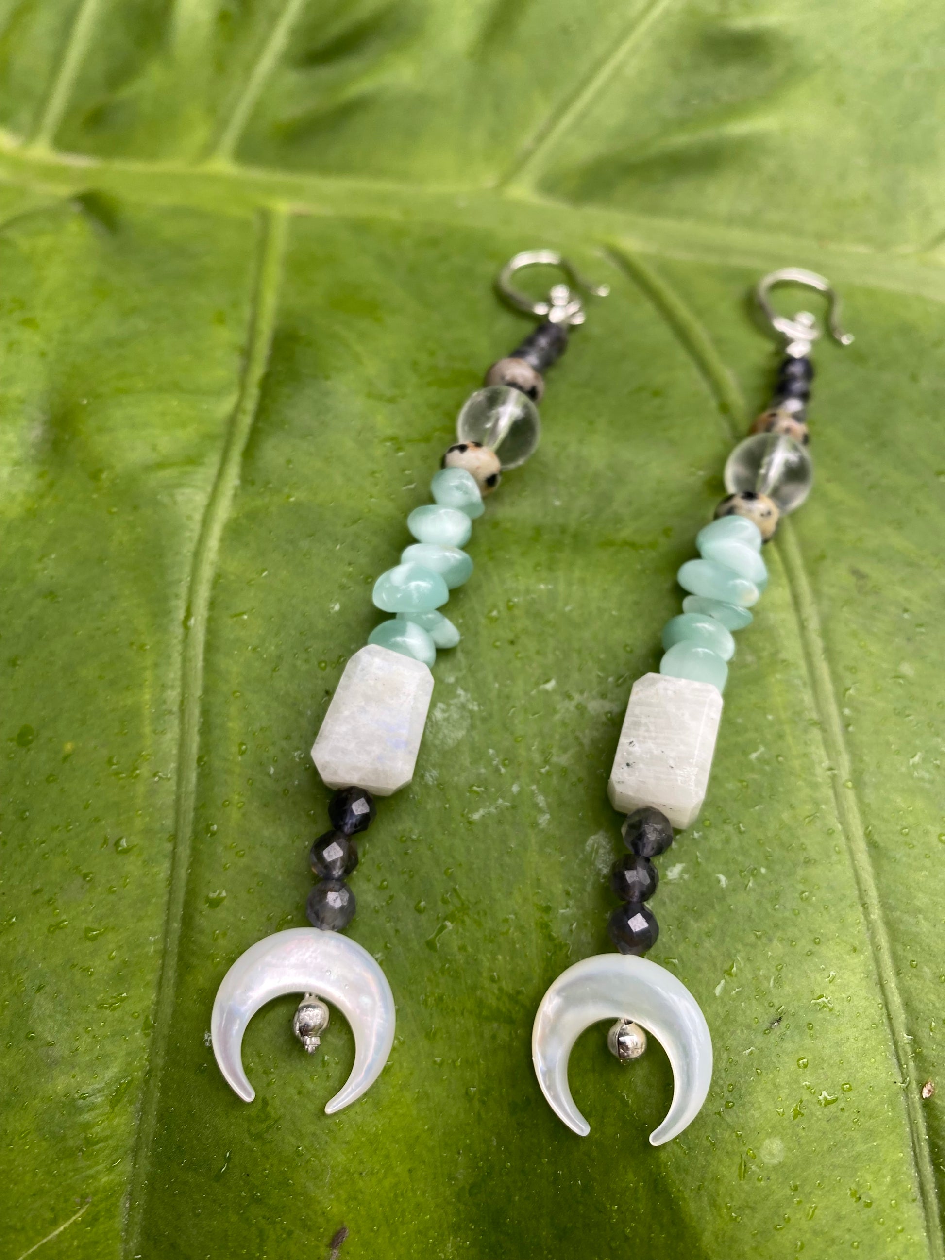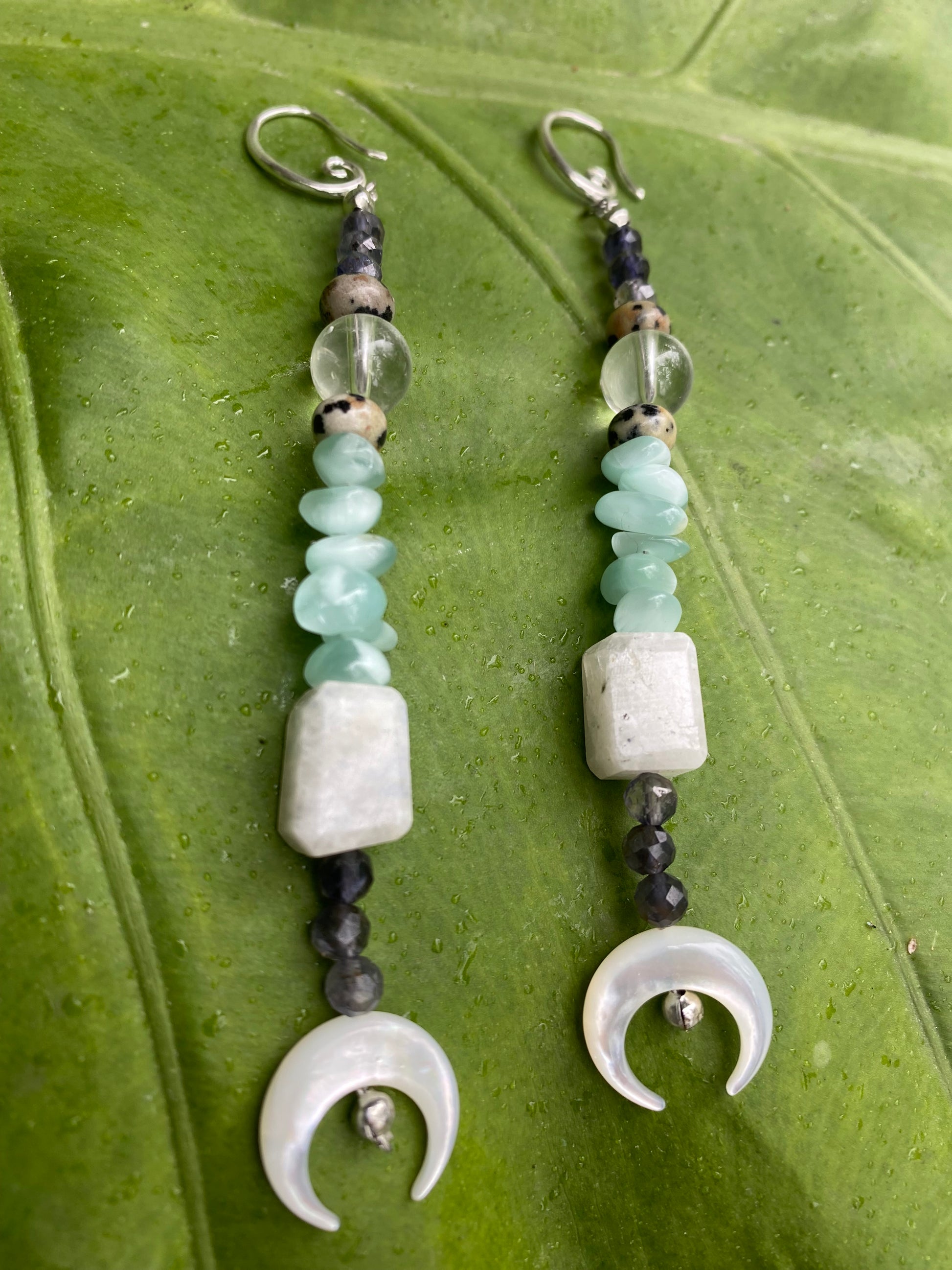 Stone Type: Iolite, Dalmatian Jasper, Rainbow Moonstone, Clear Quartz, Garnierite, Mother of Pearl