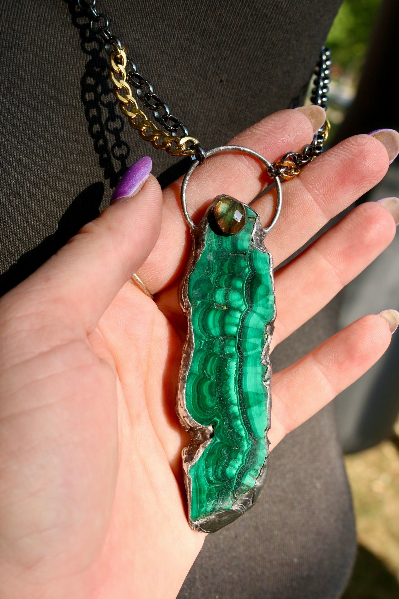 With its statement Malachite Slab, it acts as a shield of protection over your heart from any negativity lingering in places you can’t see 👀. The Labradorite acts as a beacon of light 💡, connecting to your intuition and showing you the way home to the QUEENDOM of you. 👑